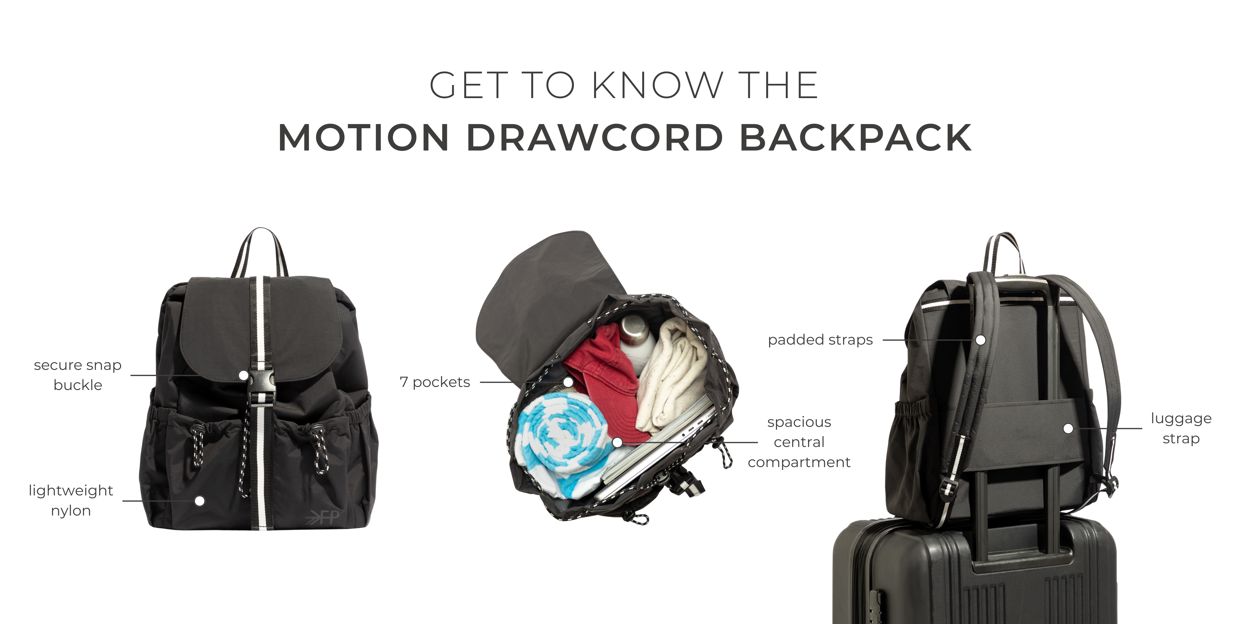 The Motion Drawcord Backpack is sized for on-the-go convenience, keeping everything in its place without weighing you down. With multiple interior and exterior pockets, it’s the ideal bag for staying organized through every adventure.